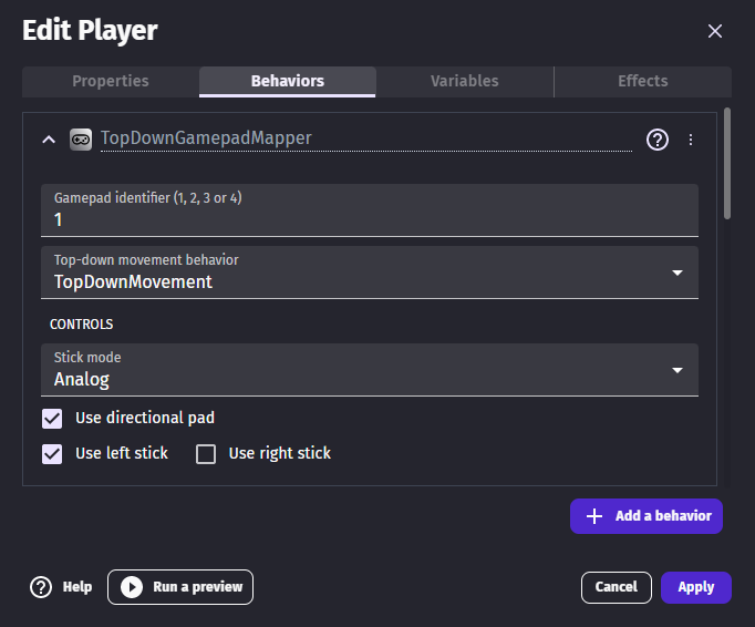 The "Platformer gamepad mapper" behavior can be added to the character to make the character move according to player inputs automatically.